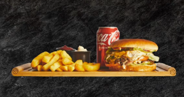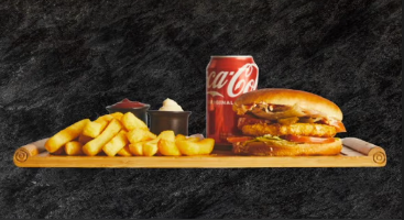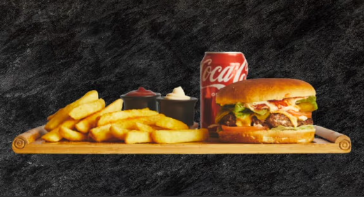 Med 200g oksekød, ost, salat, tomat,…