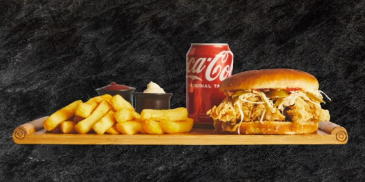 Med to kyllingefileter, hvidløg, ketchup, coleslaw…