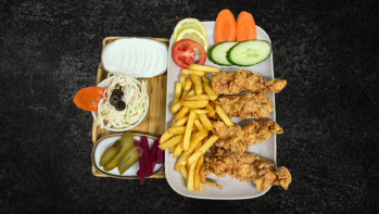 Med kylling eller kalv, hummus, tzatziki,…